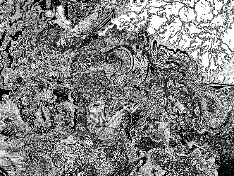 Le dessin psychédélique est une pratique presque thérapeutique trouvant sa source dans l’art brut. Dessiner en se laissant porter par son stylo, amène un résultat non prémédité surprenant, comblé par des dizaines d’heures de travail minutieux. A l’observation, la seule limite est l’étendue de son imagination.
