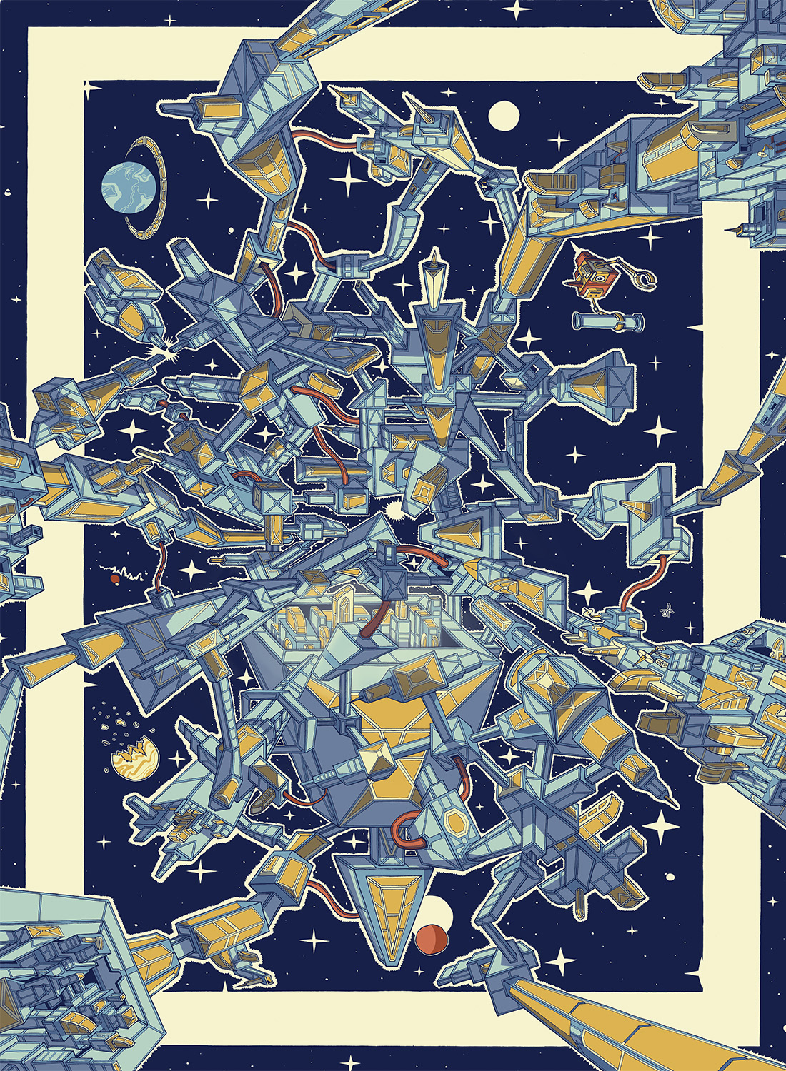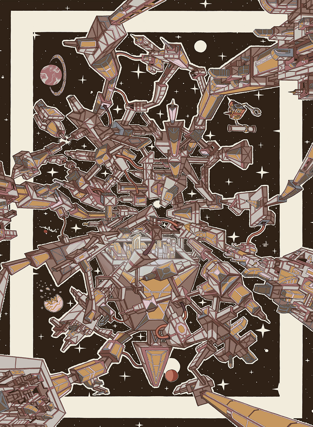 Confusus est une station alien d’observation des civilisations galactiques. Des milliers d’espèces ayant signés la trêve, cohabitent pour maintenir la paix cosmique. Ce joyeux bordel d’ethnies garde un œil sur l’univers, comme une ruche effervescente mélangeant abeilles, bourdons, frelons… Cette station loufoque, à l’aspect déstructuré, voire chaotique est au contraire la représentation parfaite de l’équilibre, fragile et casse-tête mais aux fondements solides de l’ensemble des mondes.