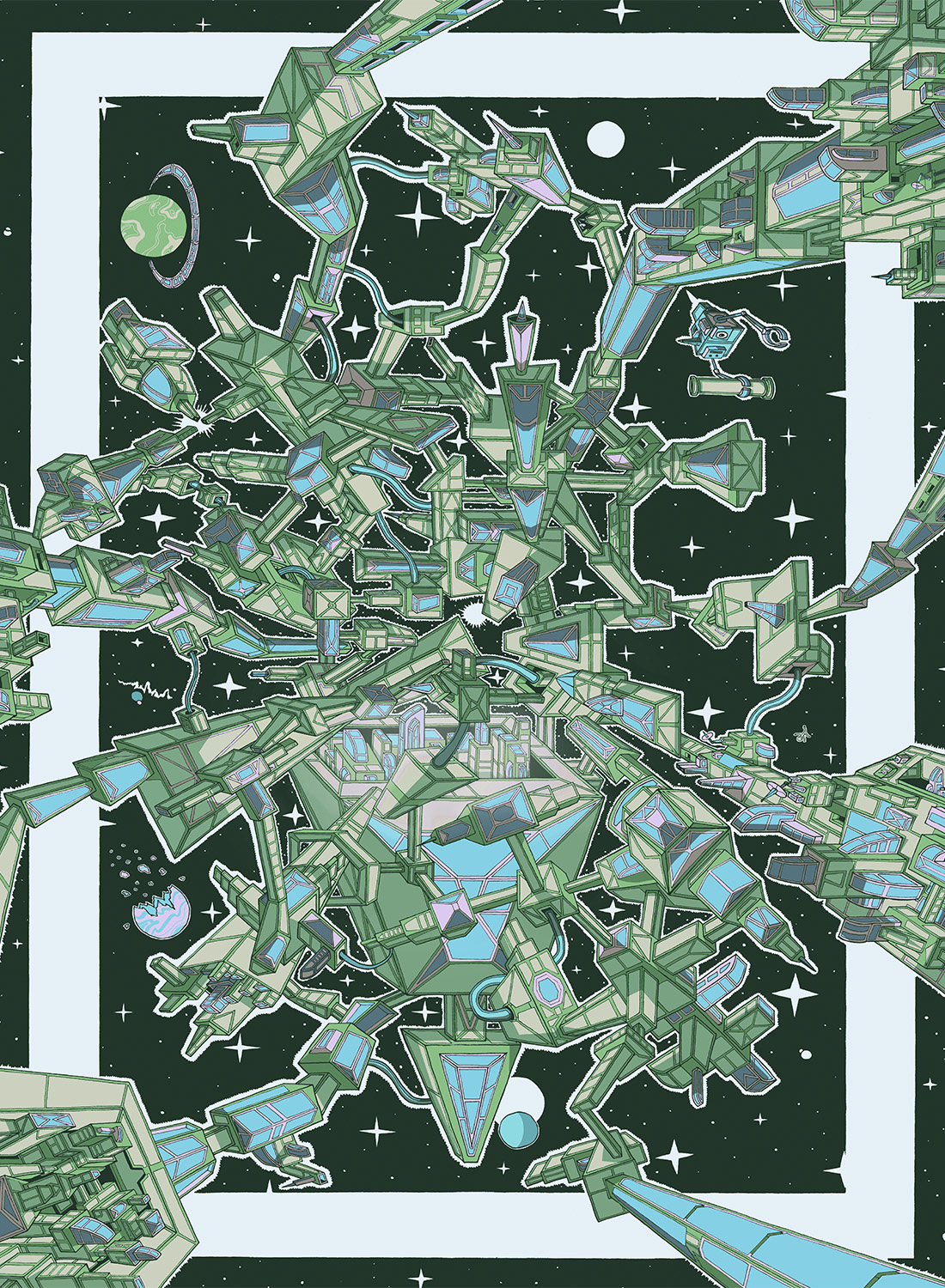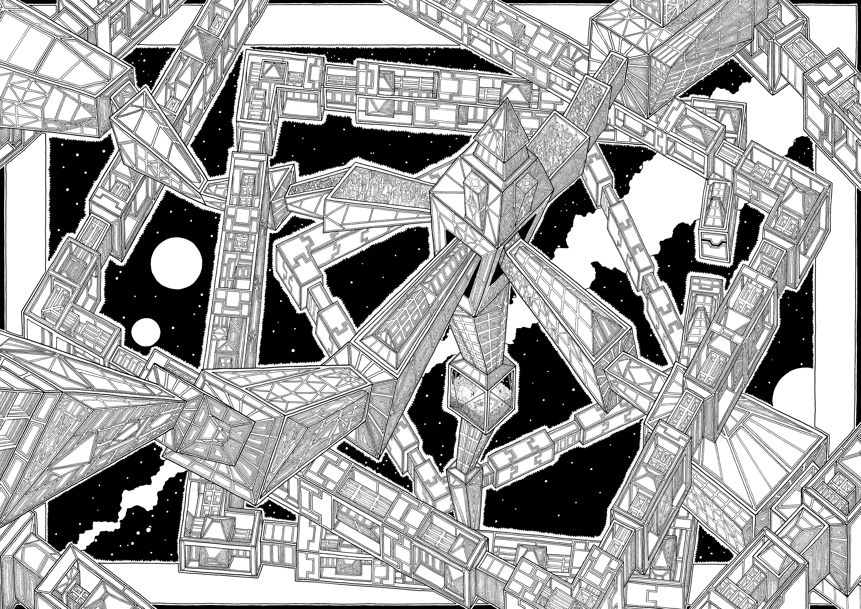 Cette pluri-église est accessible par un interminable ascenseur au centre de la tour qui loge les plus fortuné.e.s, empilé.e.s les uns sur les autres dans des appartements luxueux, avec vue sur les Anneaux, ces quartiers populaires où résident les fonctionnaires, les agents d’entretiens, les techniciens de la station, les artistes, encadrés d’une main de fer par la milice spatiale.