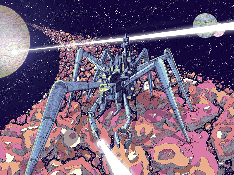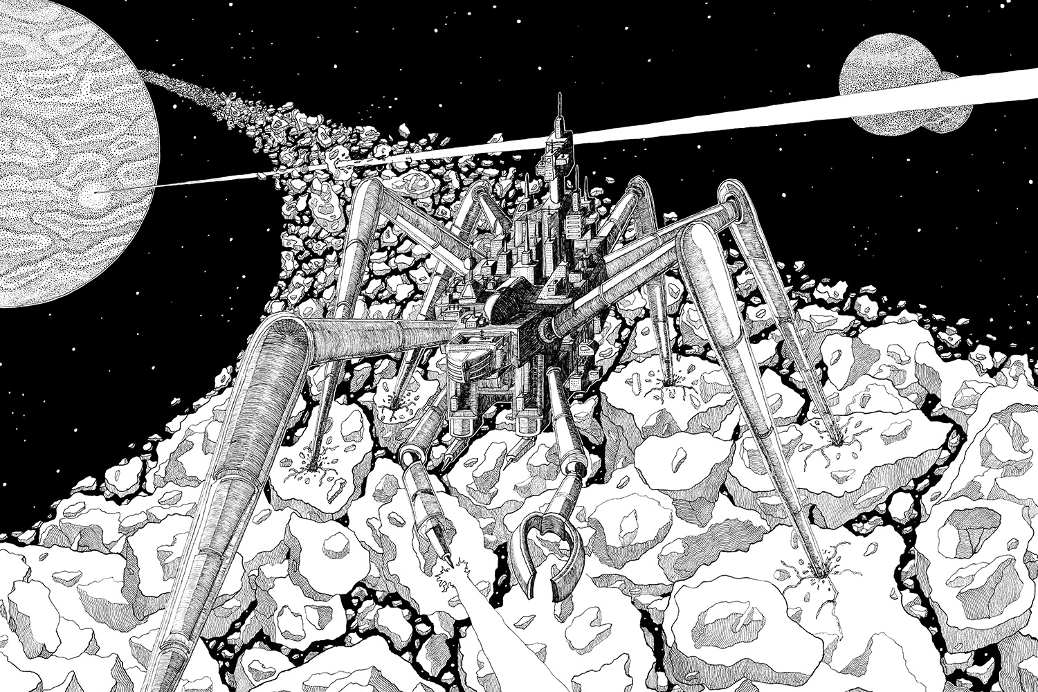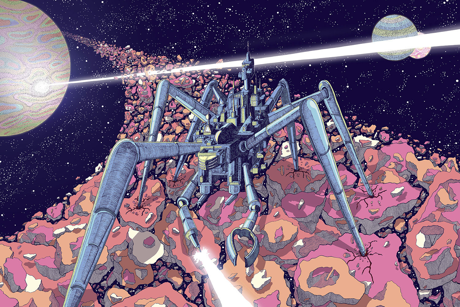 L’imposante araignée mécanique entamait sa grande traversée de l’anneau d’astéroïdes de Dimatt 8 pour la troisième fois de l’année. Aucun bâtiment ne s’est approché de la planète pour le moment. Ce vaisseau articulé est une véritable arme de destruction instantanée. Le peuple de Dimatt 8, les dimatiens, sont une population particulièrement hostile et indépendante. Pourtant résidente de Syphe, Dimatt 8 est le point noir de cette galaxie réputée pacifique. Aucun dimatien de rang élevé n’a levé le petit doigt – ou plutôt la griffe – pour représenter son peuple au coeur de Confusus, ni signé la trêve cosmique. Pourtant, d’apparence hargneuse, les dimatiens n’ont jamais attaqué qui que ce soit ! Ils ont développé tout un tas d’armes et de technologies dévastatrices simplement dans le but d’effrayer l’ennemi. C’est à se demander s’ils maîtrisent vraiment leurs « jouets du chaos »… En attendant le parfait inconscient qui oserait poser la patte sur ne serait-ce qu’un morceau d’astéroïde, Spider Space City loge toute une armée prête à dégainer leurs pisto-laser et leurs canons atomiques au moindre pet de mouche.